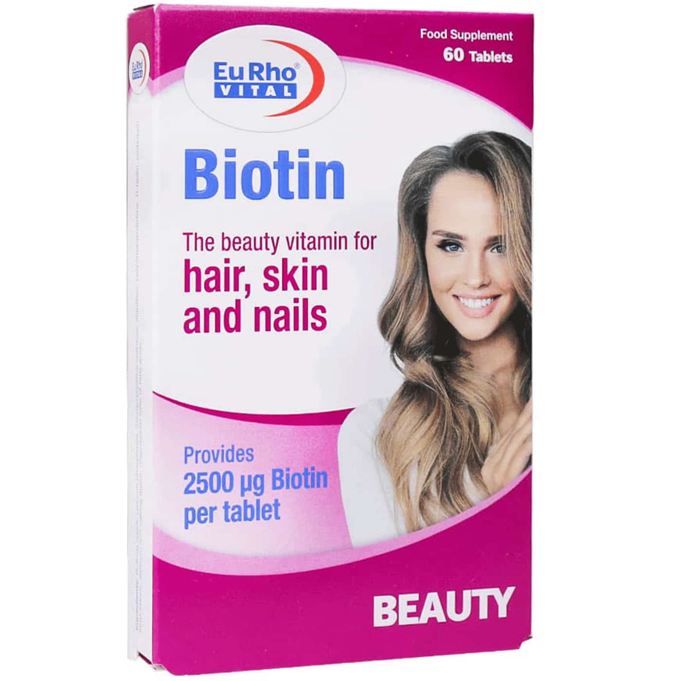 قرص بیوتین ۲۵۰۰ میکروگرم یوروویتال – بسته ۶۰ عددی (به انگلیسی: Eurho Vital Biotin 2500 mcg – 60 Tablets) یک مکمل غذایی ویتامین B۷ (بیوتین) است که برای حفظ سلامت پوست، مو و ناخن طراحی شده و به متابولیسم طبیعی بدن کمک میکند.