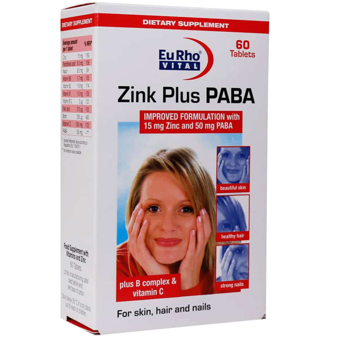 قرص زینک پلاس پابا یوروویتال – بسته ۶۰ عددی (به انگلیسی: Eurho Vital Zinc Plus PABA 60 Tabs) یک مکمل غذایی ترکیبی حاوی روی (زینک)، PABA و ویتامینهای گروه B و ویتامین C است که برای حفظ سلامت پوست، مو، ناخن و تقویت سیستم ایمنی بدن طراحی شده است.